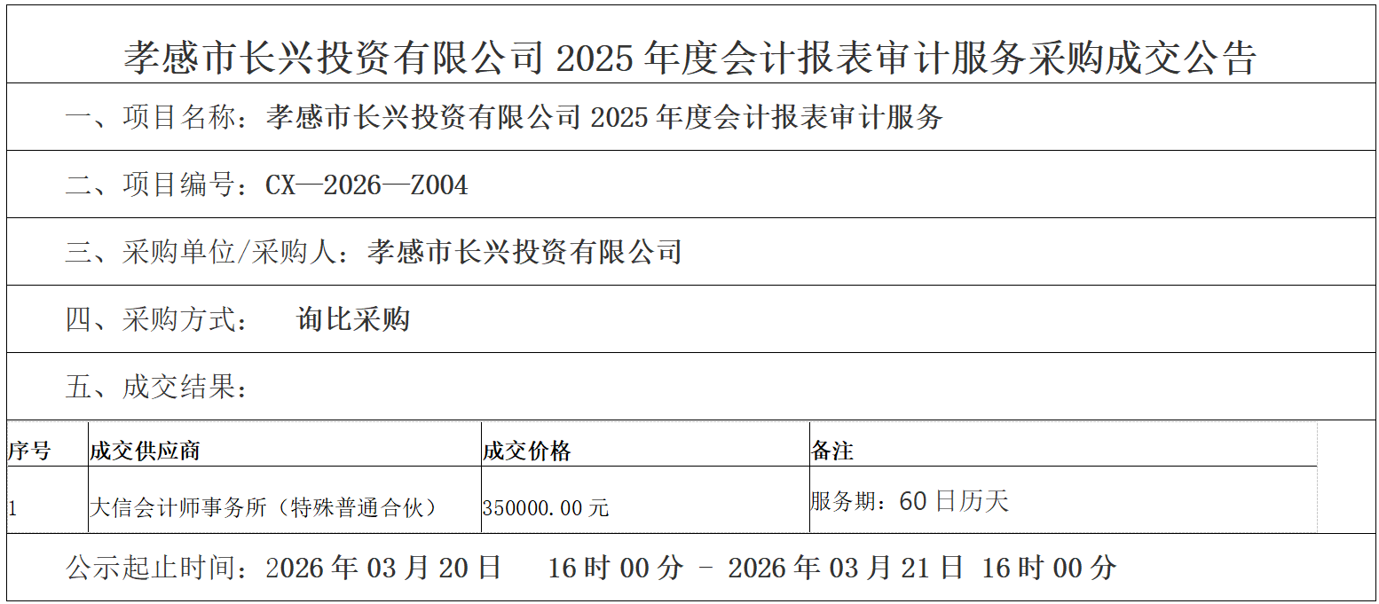 孝感市长兴投资有限公司2025年度会计报表审计服务采购成交公告